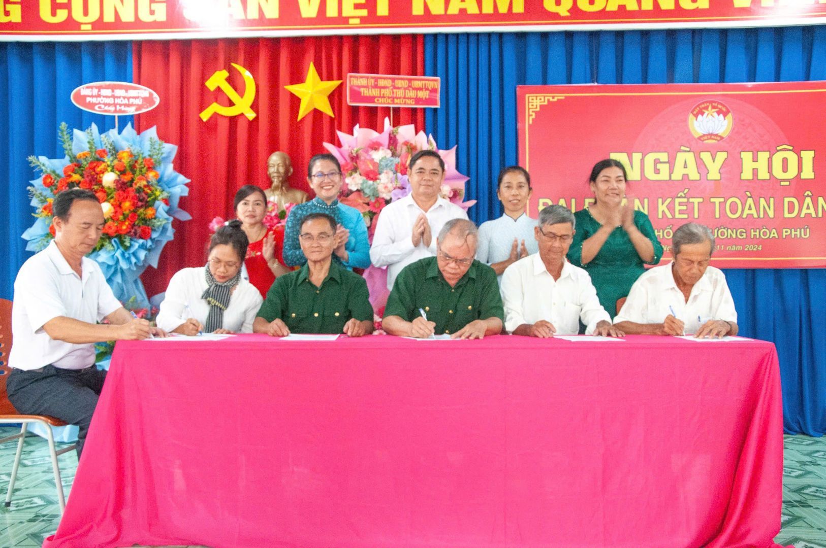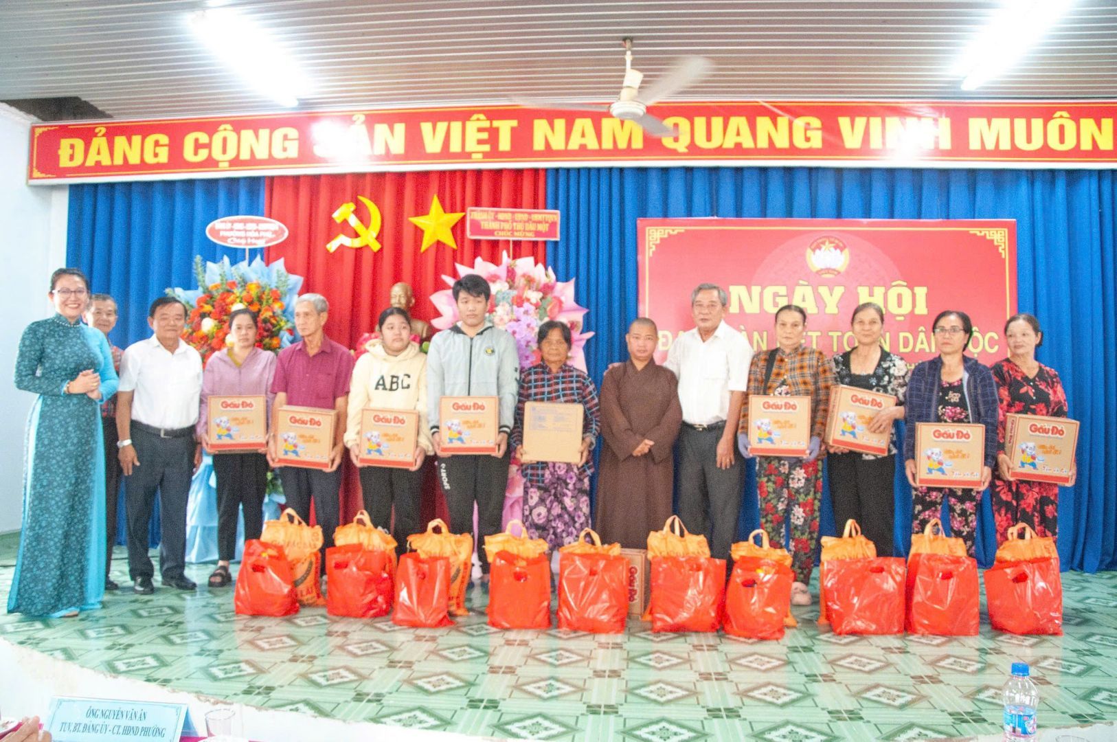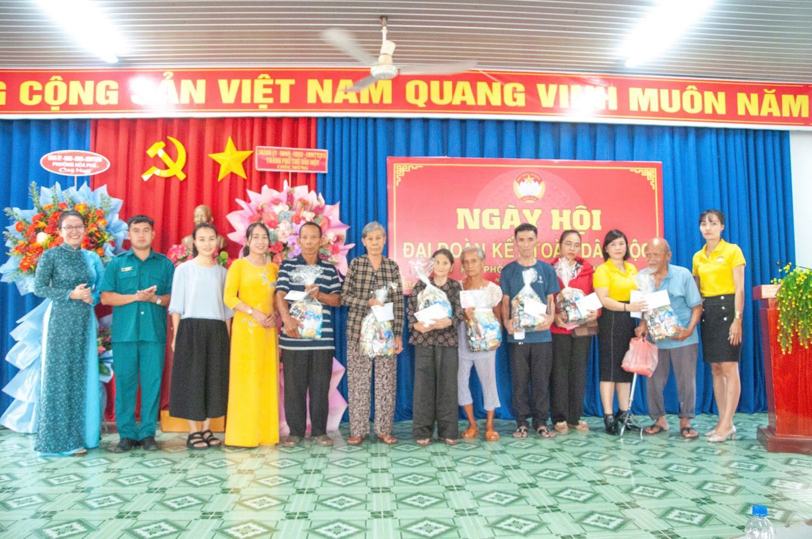 Nhân dịp Ngày Hội, lãnh đạo Thành phố Thủ Dầu Một và lãnh đạo phường Hòa Phú tặng 13 phần quà hộ nghèo, cận nghèo mỗi phần trị giá 500.000 đồng; Tặng học bổng cho học sinh thuộc diện hộ nghèo, cận nghèo, mỗi phần trị giá 1.000.000 đồng và tập dụng cụ học tập trị giá 200.000 đồng. Tặng 20 phần quà cho công nhân có hoàn cảnh khó khăn, mỗi phần trị giá 500.000 đồng gồm gạo, mì và nhu yếu phẩm. Tặng 10 phần quà các cụ già neo đơn có hoàn cảnh khó khăn trên địa bàn phường, tổng cộng 54 phần trị giá 38.300.000 đồng.