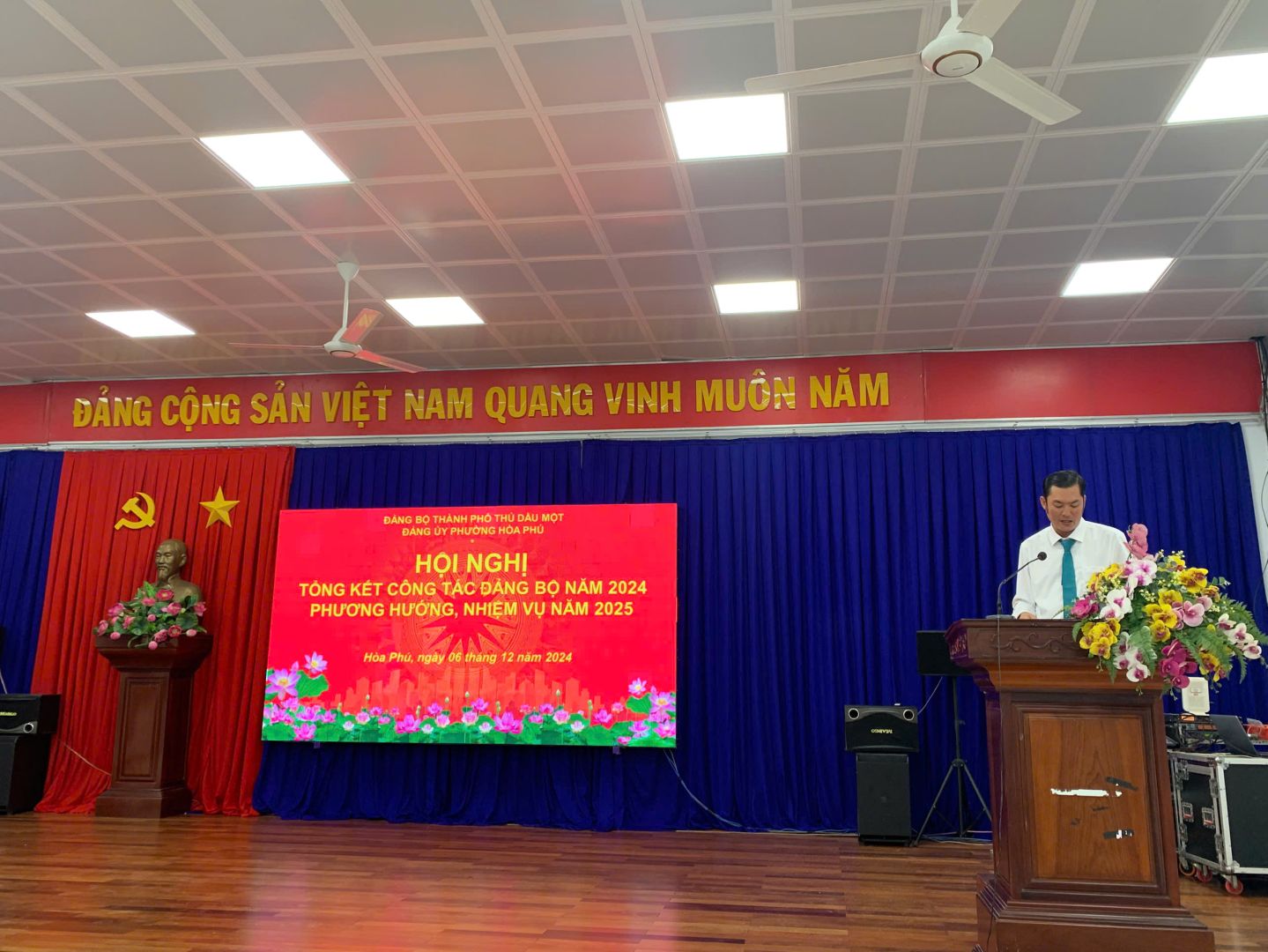 Sáng ngày 06/12/2024, Đảng ủy phường Hòa Phú tổ chức Hội nghị tổng kết công tác Đảng bộ năm 2024, phương hướng nhiệm vụ năm 2025. Dự Hội nghị có đồng chí Nguyễn Hữu Thạnh – PBTTT thành ủy, Chủ tịch HĐND thành phố; đồng chí Đỗ Hữu Phước – Phó Trưởng ban Dân vận Thành ủy; đồng chí Huỳnh Yến Nhi – Chuyên viên UBKT Thành ủy. Chủ trì Hội nghị đồng chí Nguyễn Văn Ân - Thành ủy viên, Bí thư Đảng ủy, CT. HĐND phường; đồng chí Nguyễn Văn Đức - Phó Bí thư Thường trực Đảng ủy phường; đồng chí Nguyễn Phan Quỳnh Như - Phó Bí thư, Chủ tịch UBND phường, cùng dự có các đồng chí Ủy viên Ban Thường vụ, Ủy viên Ban Chấp hành Đảng bộ phường, đại diện
