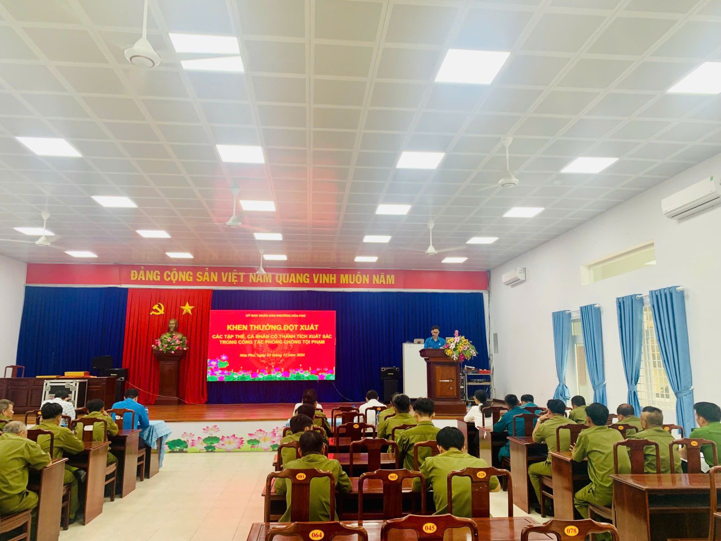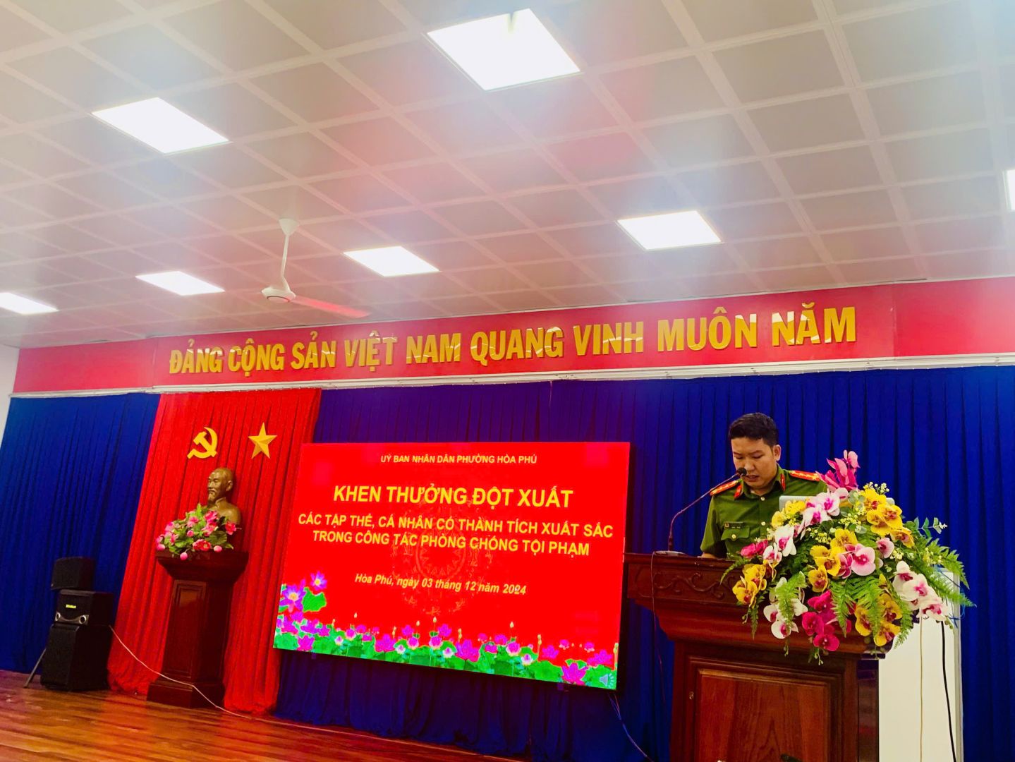 Sáng ngày 03/12/2024, Tại hội trường UBND phường Hòa Phú đã tổ chức Khen thưởng đột xuất các tập thể, cá nhân có thành tích xuất sắc trong công tác phòng chống tội phạm trên địa bàn phường Hòa Phú.