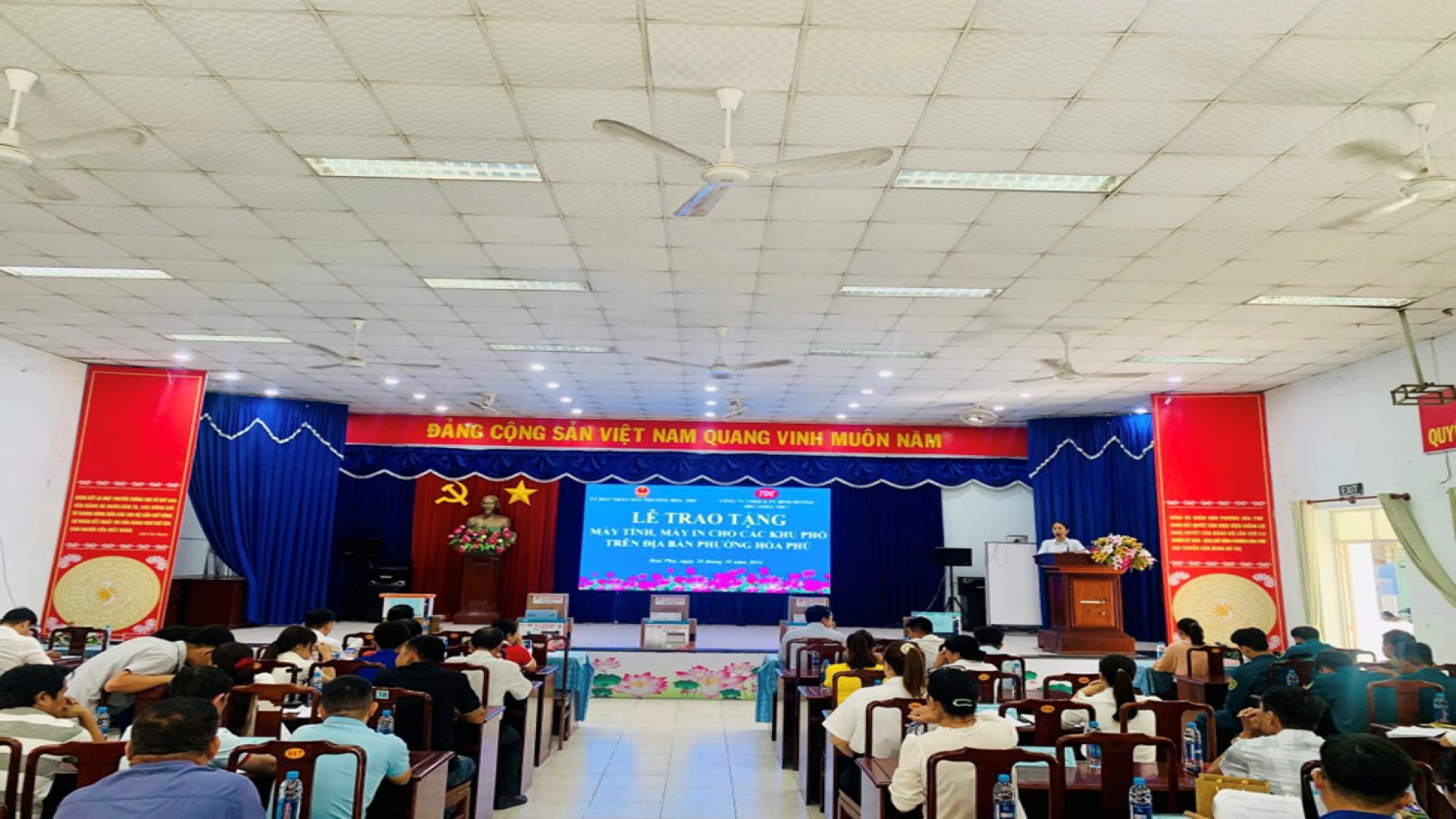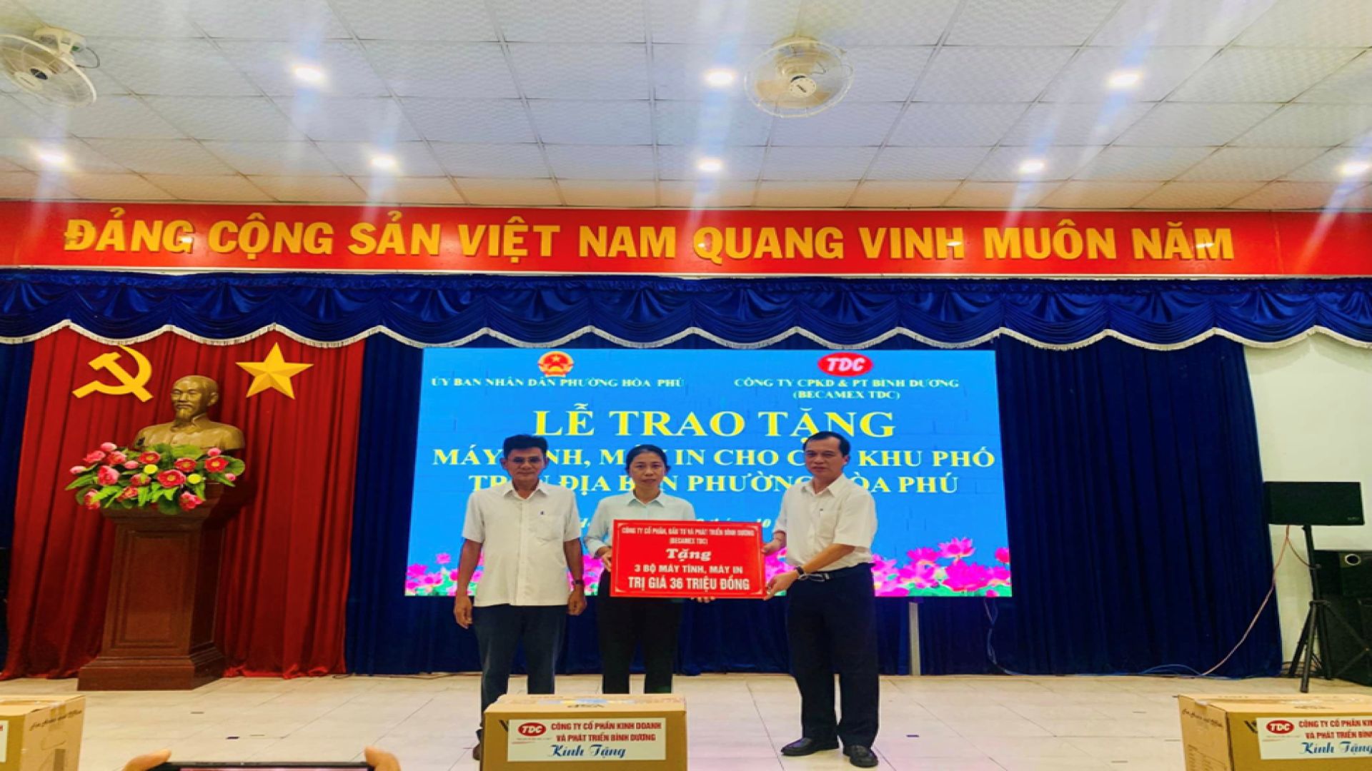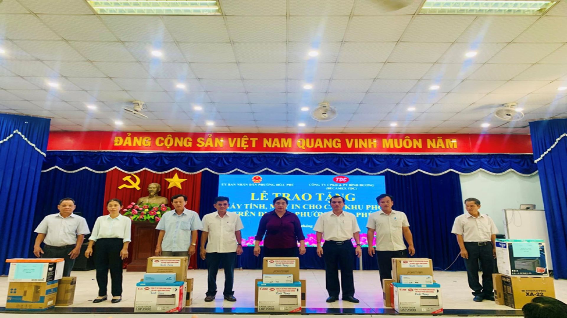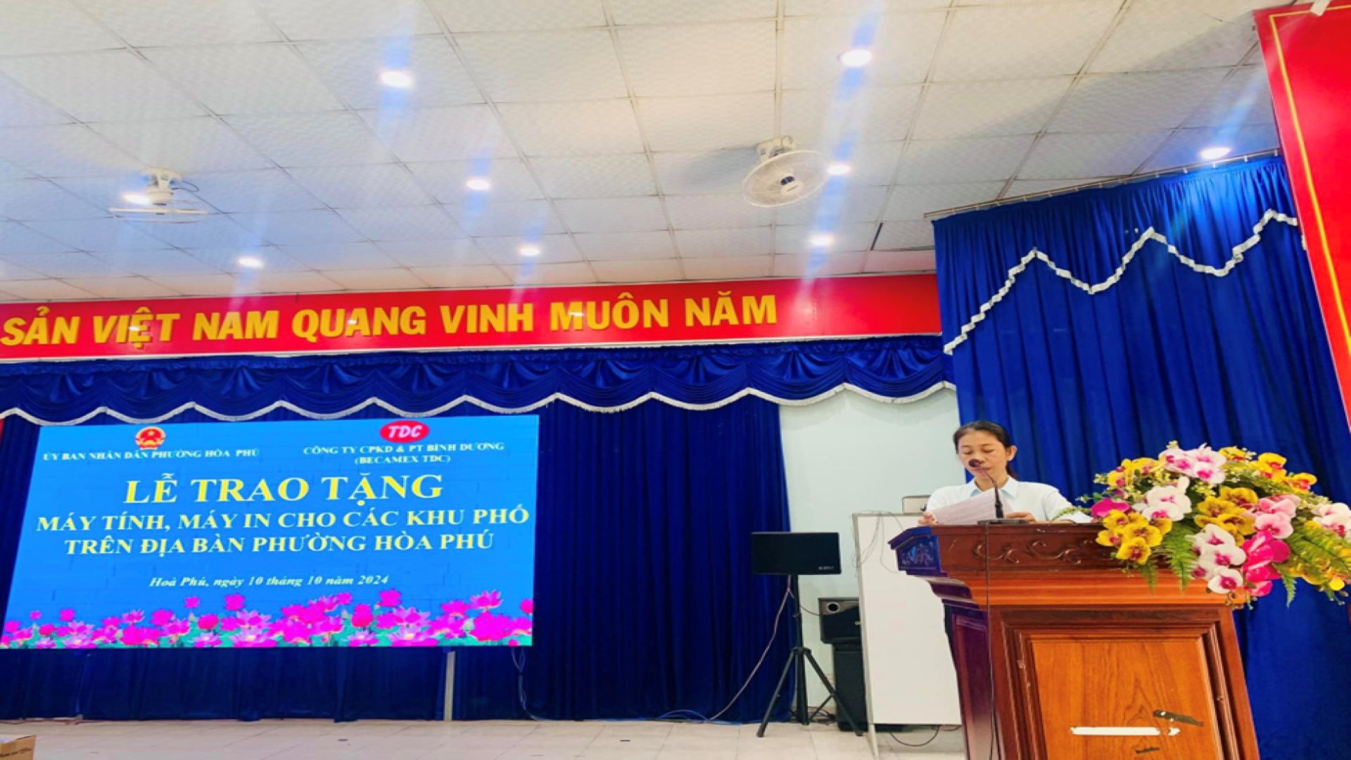 Sáng ngày 10/10/2024, phường Hòa Phú tổ chức trao tặng thiết bị máy tính, máy in cho 05 khu phố. Về phía địa phương có đồng chí Nguyễn Văn Đức – Phó Bí thư TT Đảng ủy phường; Đồng chí Nguyễn Phan Quỳnh Như - Phó Bí thư Đảng ủy, Chủ tịch UBND phường. Ông Hồ Hoàn Thành – Phó TGĐ Công ty CPKH & PT Bình Dương (Becamex IDC) nhà trài trợ; cùng Trưởng phó Ban điều hành 05 khu phố;