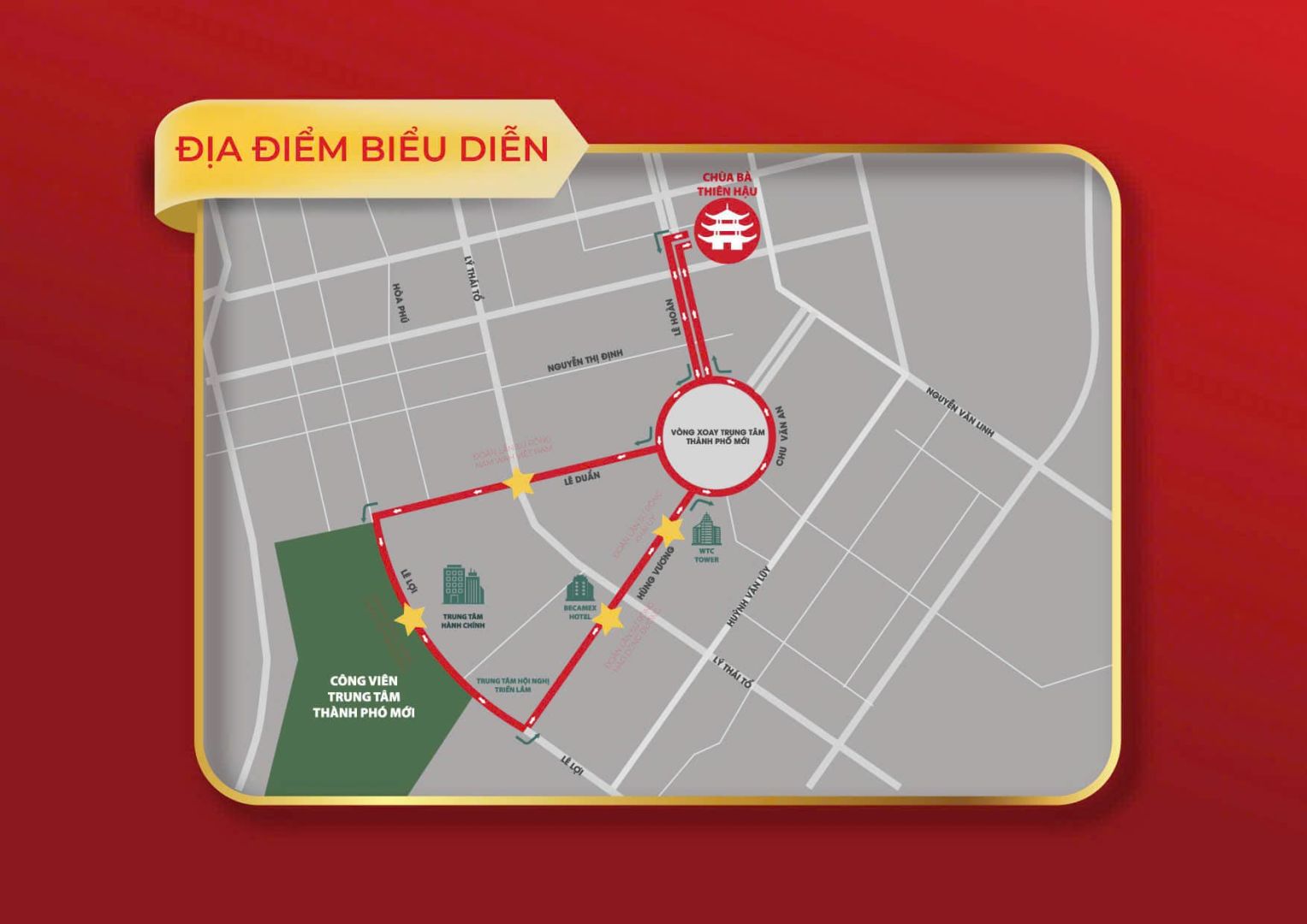 Lộ trình rước kiệu: Kiệu Bà được rước đi qua các tuyến đường chính quanh khu vực Trung tâm hành chính tỉnh Bình Dương. Lịch trình bắt đầu từ chùa Bà Thiên Hậu, đường Lê Hoàn đến đường Chu Văn An, đường Lê Duẩn, đường Lê Lợi, đường Hùng Vương, sau đó quay trở về chùa Bà Thiên Hậu (KÈM THEO SƠ ĐỒ)